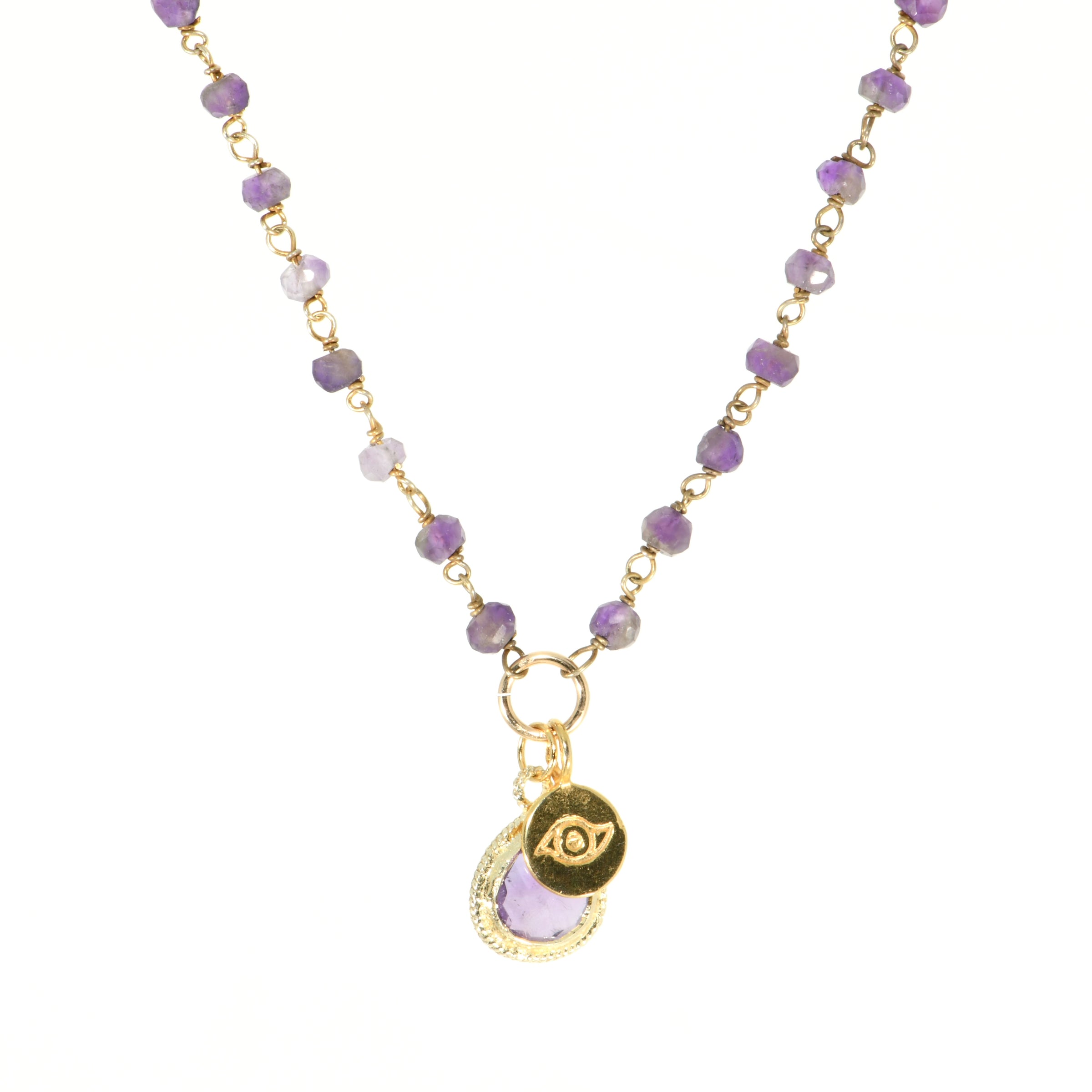 Gold Filled Amethyst Rosary Choker & Wrap Bracelet with Evil Eye Charm and Bezel Amethyst Pendant, 15"