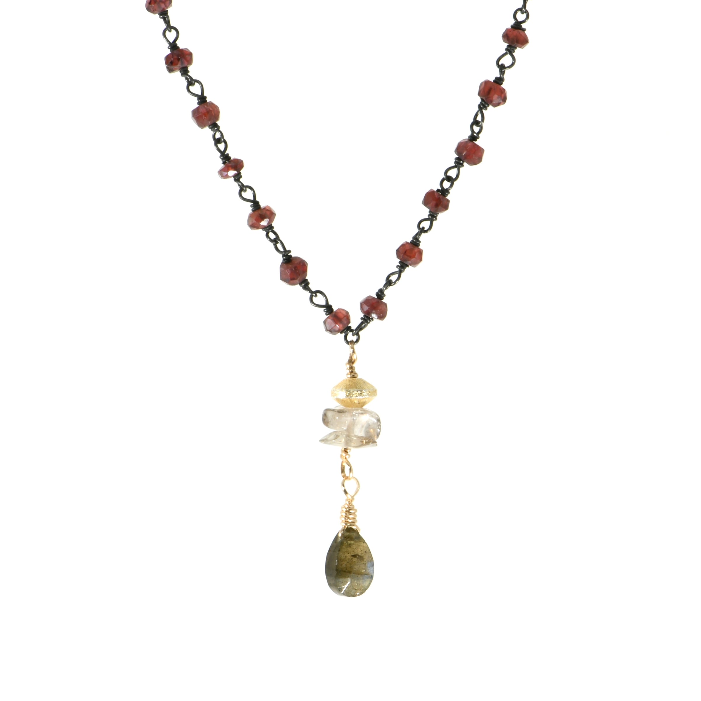Sterling Silver Garnet Rosary Necklace with Gold Filled Smokey Quartz and Labradorite Droplet