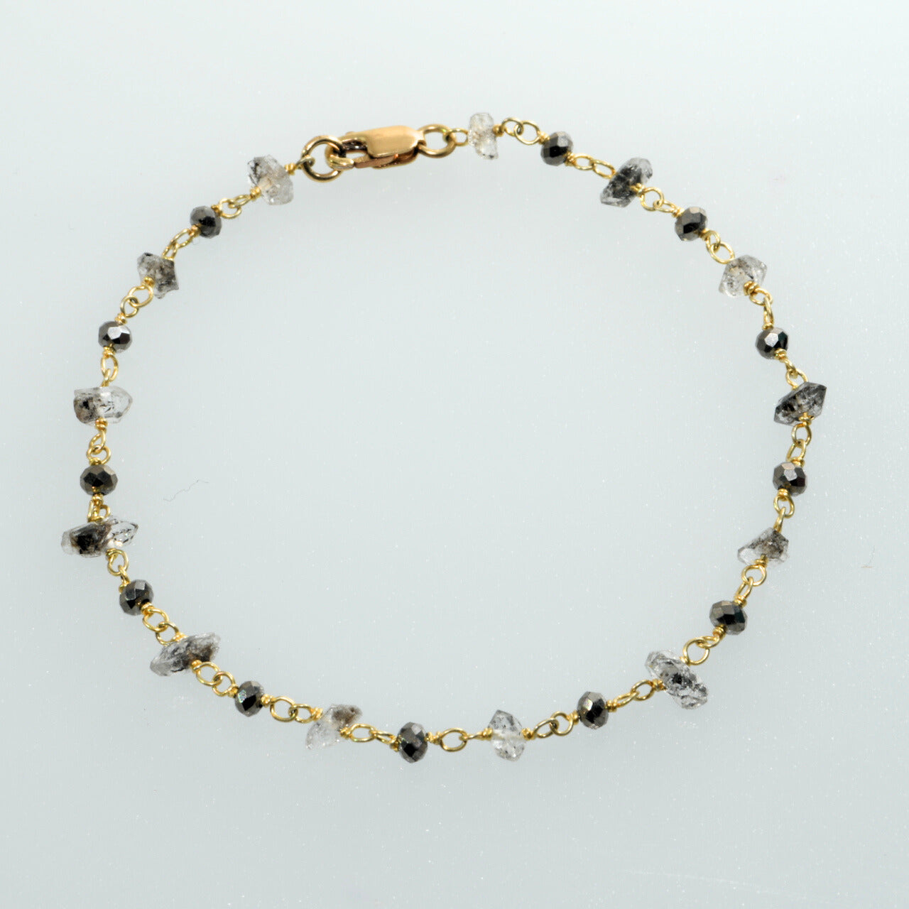 Herkimer diamonds aren't actually diamonds - they're double-terminated quartz crystals found in Herkimer County, New York. They're naturally faceted and incredibly clear, which is why they earned the diamond name. These are left raw and unpolished, so each one catches light differently. The black spinel beads create visual breaks between the crystals and keep the bracelet from looking too precious.