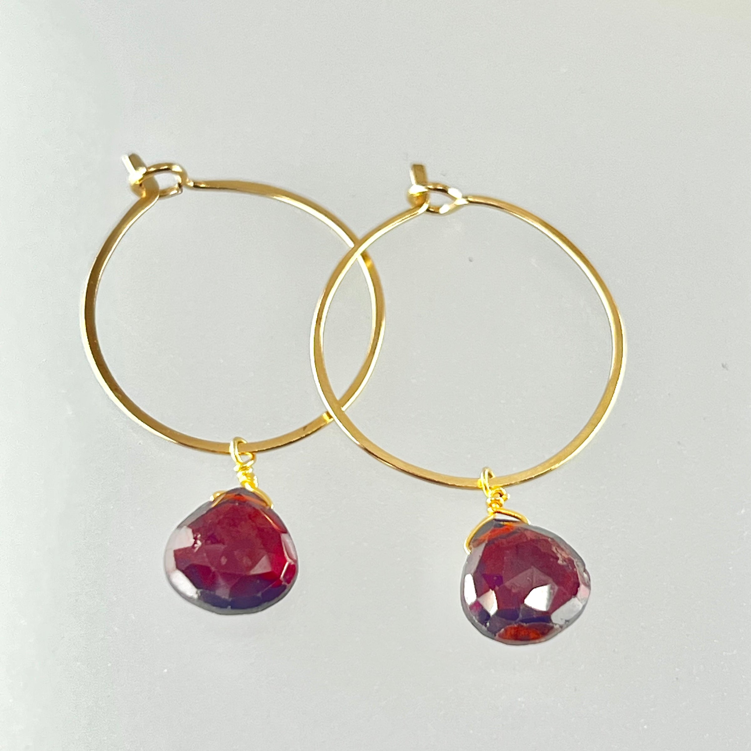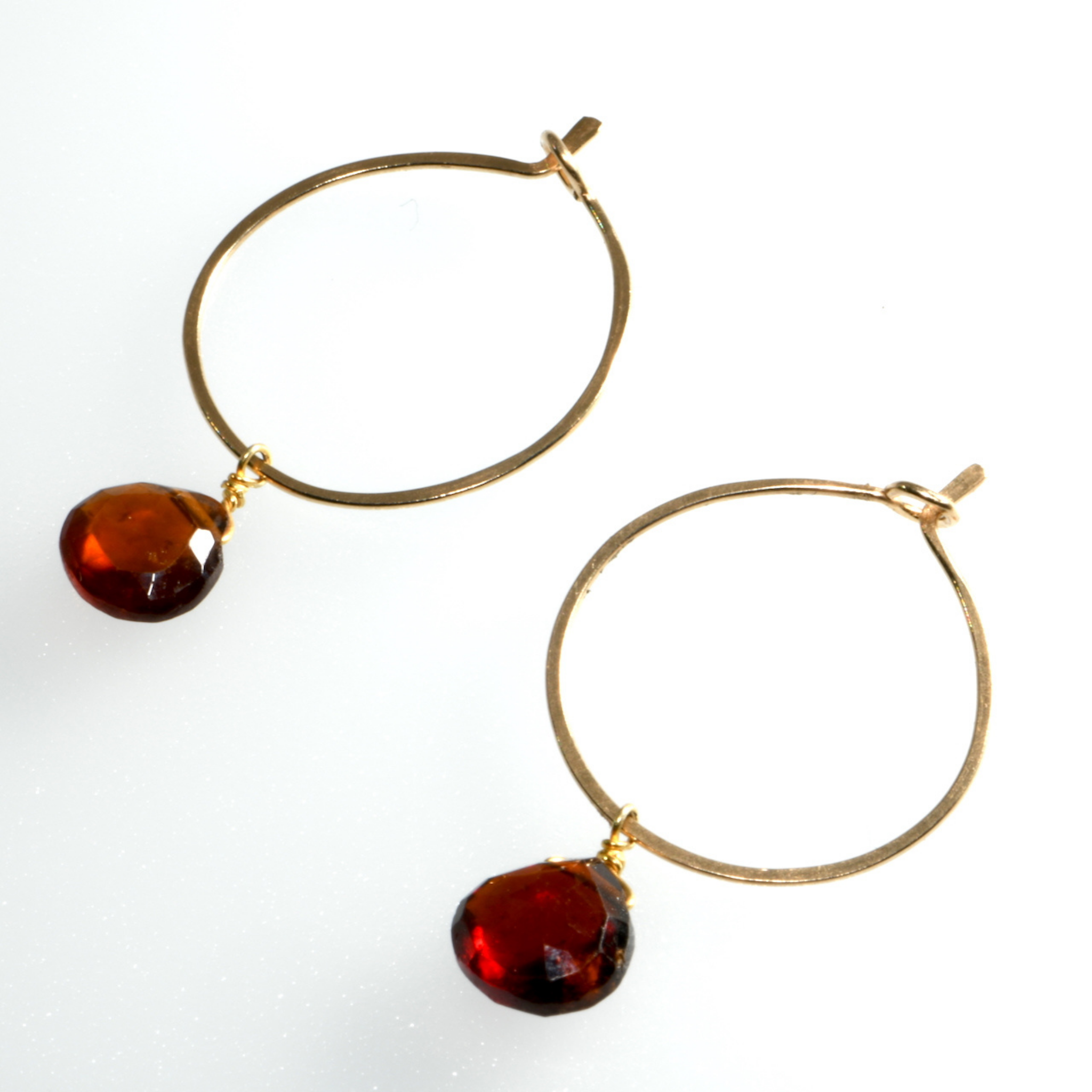 These lightweight hoops feature rich, honey-toned hessonite garnet teardrops that catch the light beautifully. The warm amber-red stones are individually wire-wrapped onto small gold hoops, creating a piece that's substantial enough to notice but comfortable for all-day wear.
