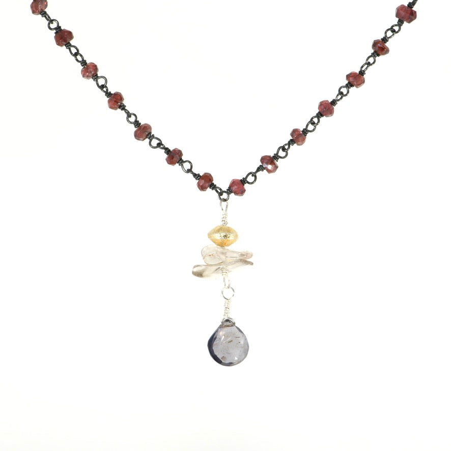 Garnet Rosary Chain Necklace with Iolite & Smoky Quartz Pendants – 16" Dainty Layering Gemstone Necklace
