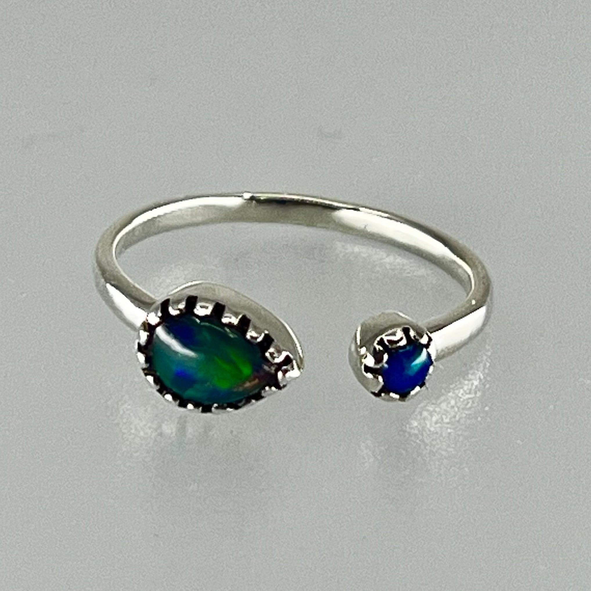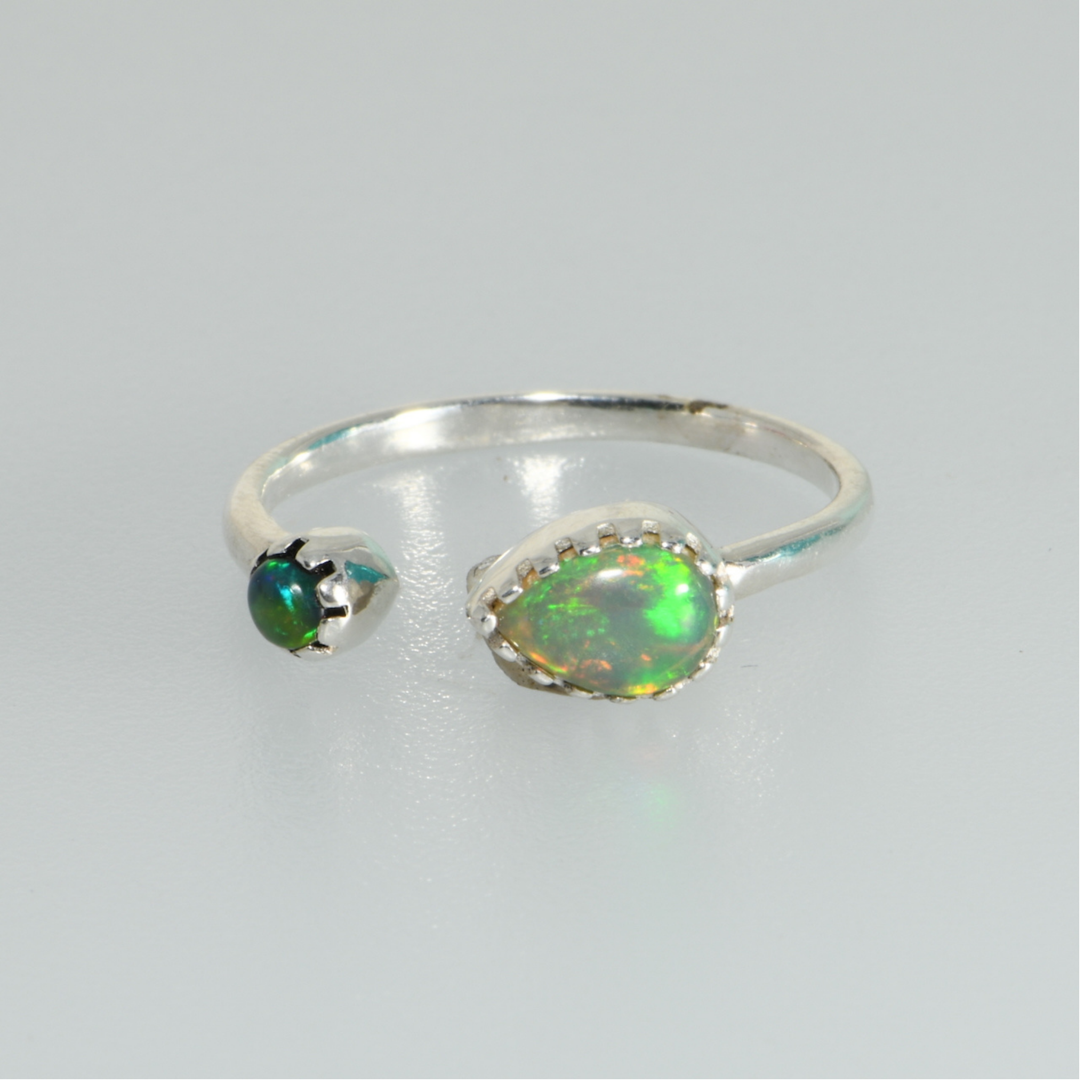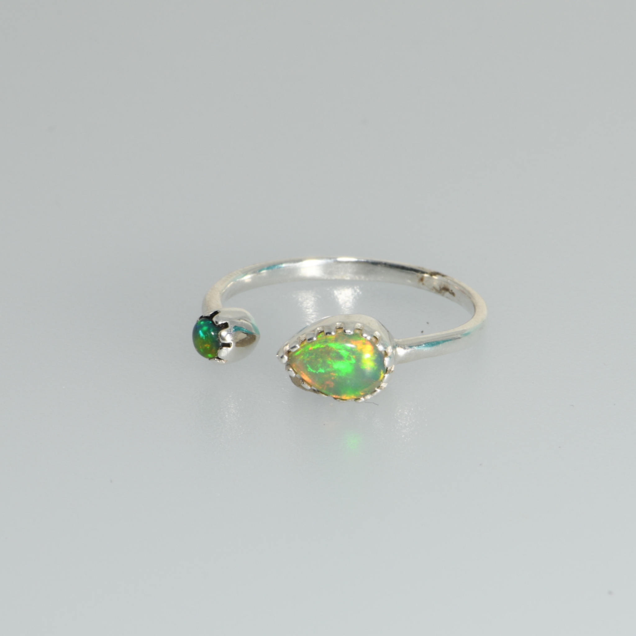 Ethiopian opals are known for their vivid play-of-color, and this ring showcases exactly why. The larger oval stone displays bright green, orange, and yellow flashes, while the smaller round stone shows deeper green tones. The contrast between the two creates visual interest. The open design between the stones isn't just aesthetic, it allows you to gently squeeze or expand the band for a more customized fit, which is helpful on days when your fingers swell or shrink slightly.