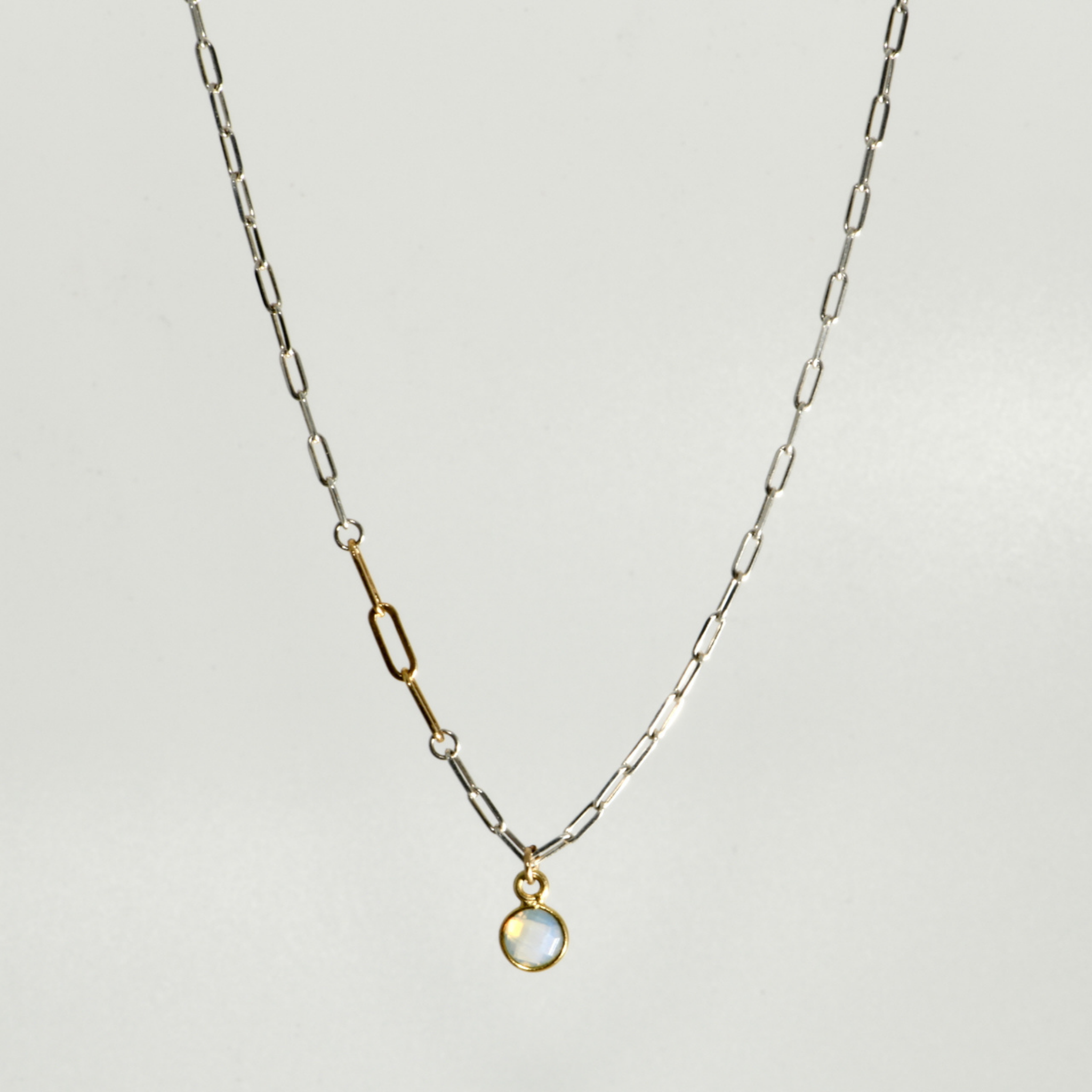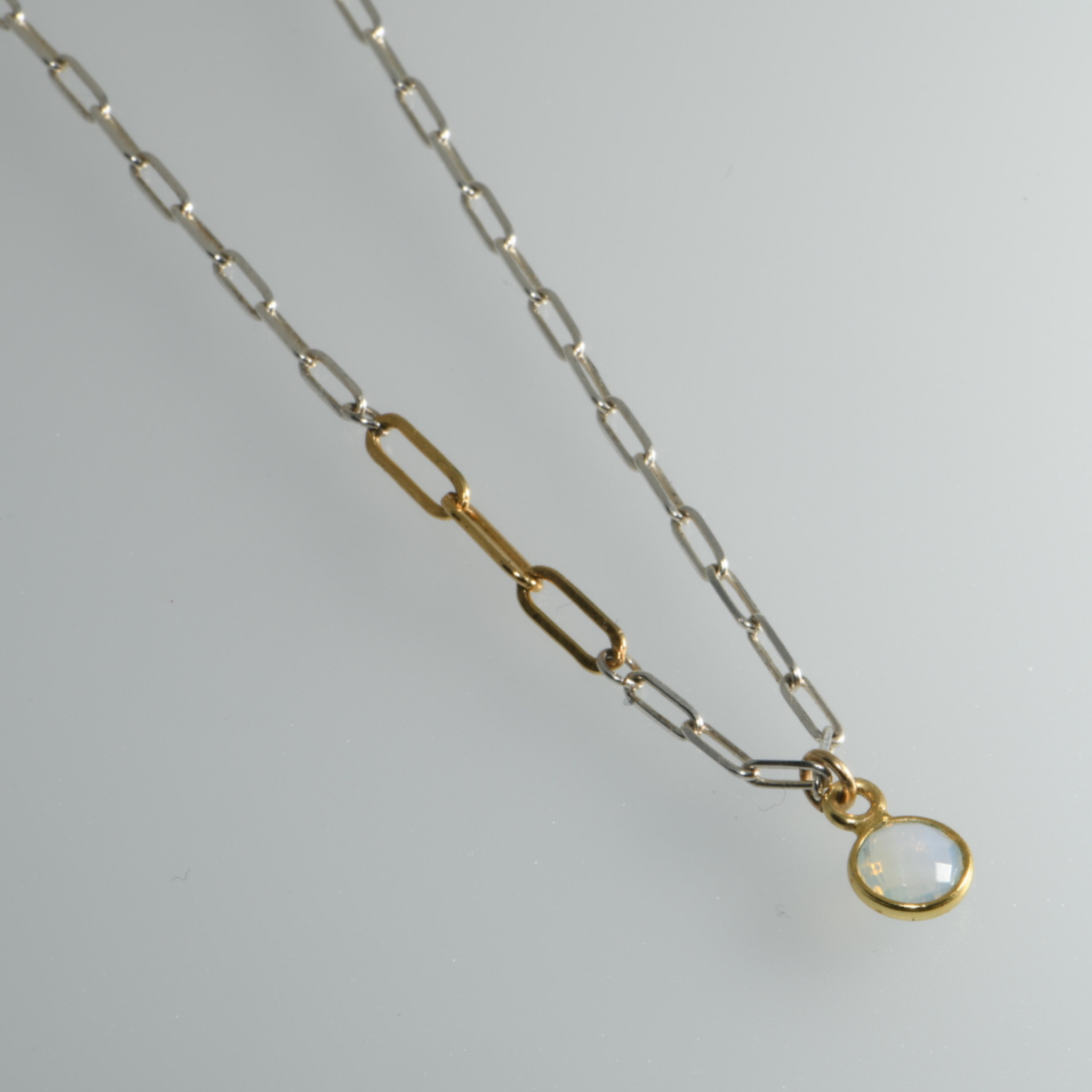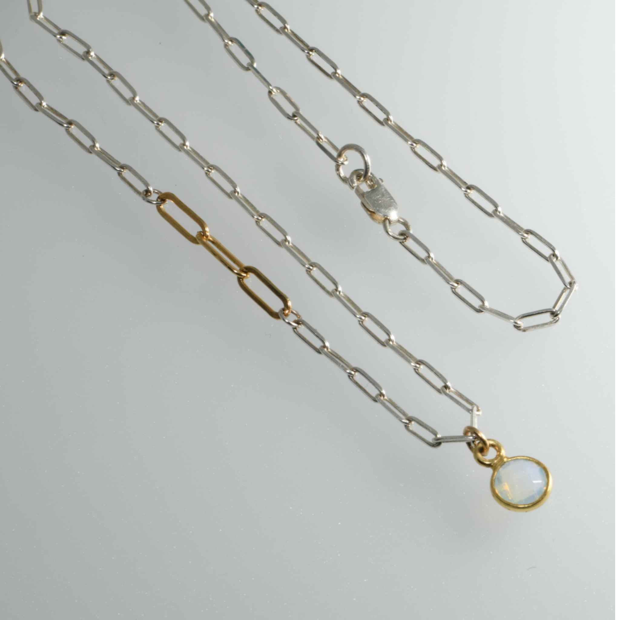 This mixed metal necklace proves that silver and gold can absolutely be worn together. The delicate opal charm sits in a gold-filled bezel, connected to a sterling silver paperclip chain with strategic gold-filled links that create visual rhythm without overwhelming the piece.