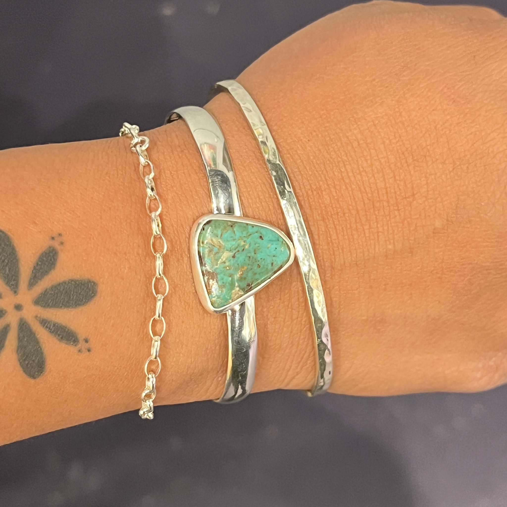 The Turquoise Story Set is a ready-made jewelry stack built around meaning, simplicity, and everyday wear. Three bestselling sterling silver pieces — a natural turquoise cuff, a lightly hammered silver bangle, and a 7" rolo chain bracelet — designed to be worn together or mixed into her existing collection.