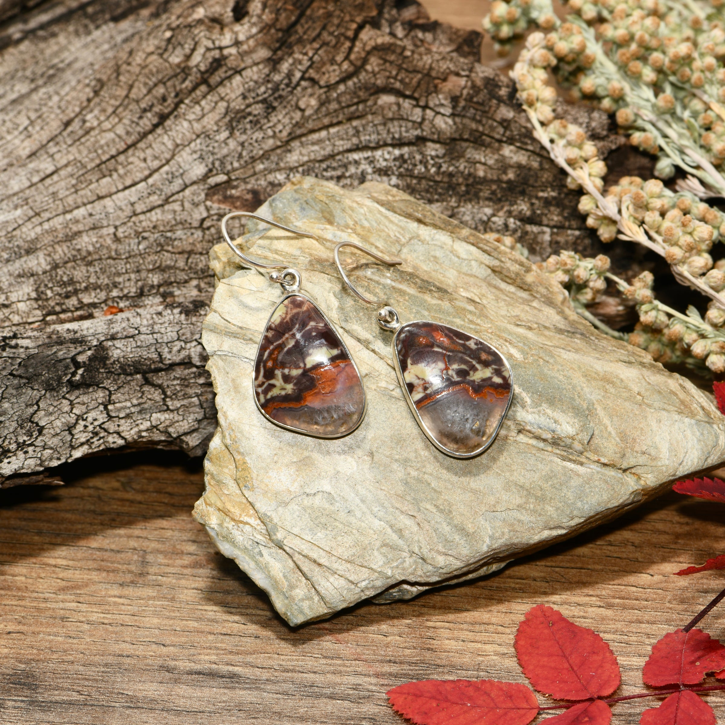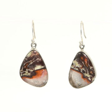 Crazy lace agate forms in bands and swirls from mineral deposits over millions of years. These particular stones have rich burgundy and rust tones mixed with cream - warmer than most agates you'll see. The hand-fabricated bezels are filed smooth so there's nothing to snag. Sterling silver throughout means no irritation if you have sensitive ears.