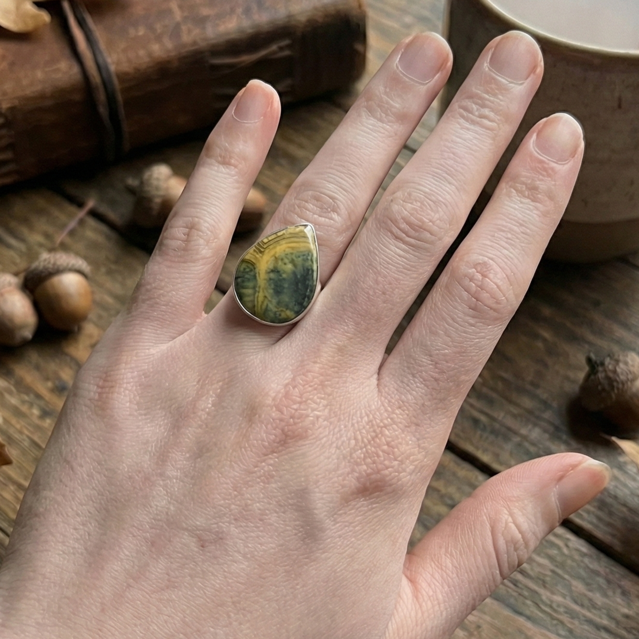 This ocean jasper ring looks like a tiny landscape—waves of golden sand, soft peach, and deep forest green flowing through an organic teardrop stone. It’s earthy, calm, and beautifully understated, the kind of piece that makes even a simple outfit feel intentional.