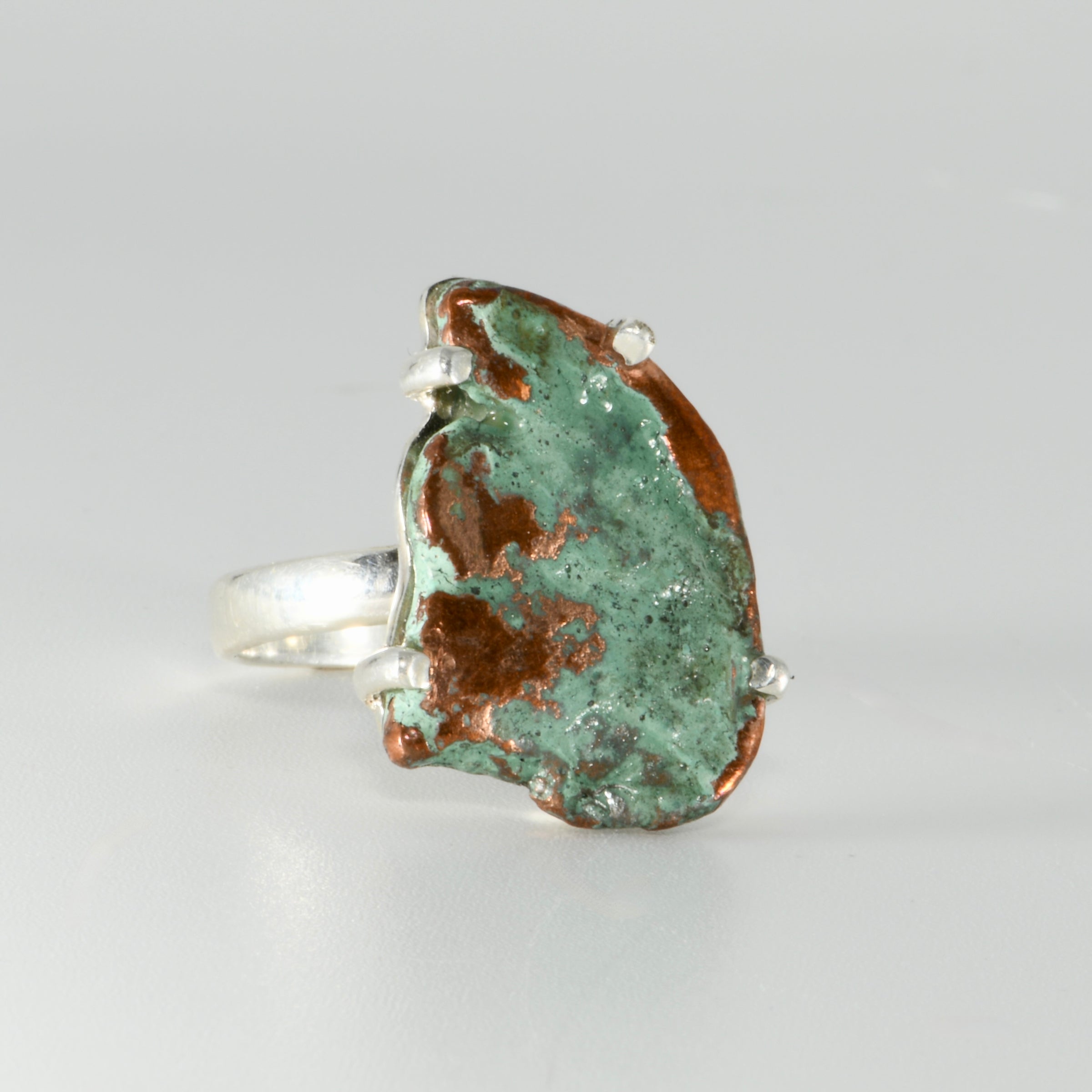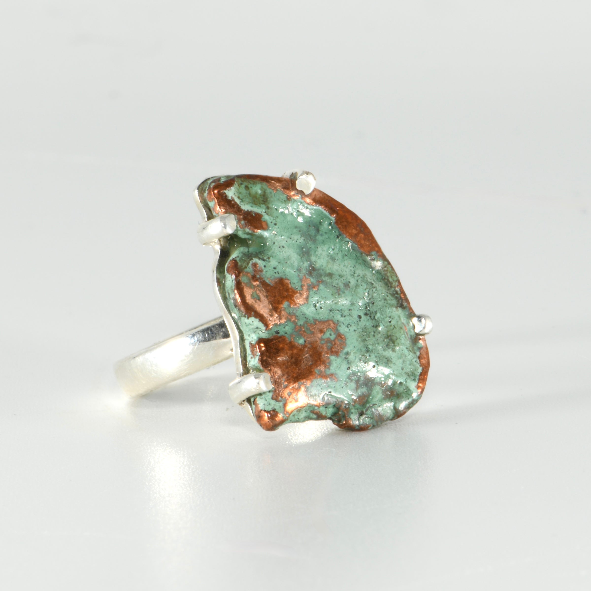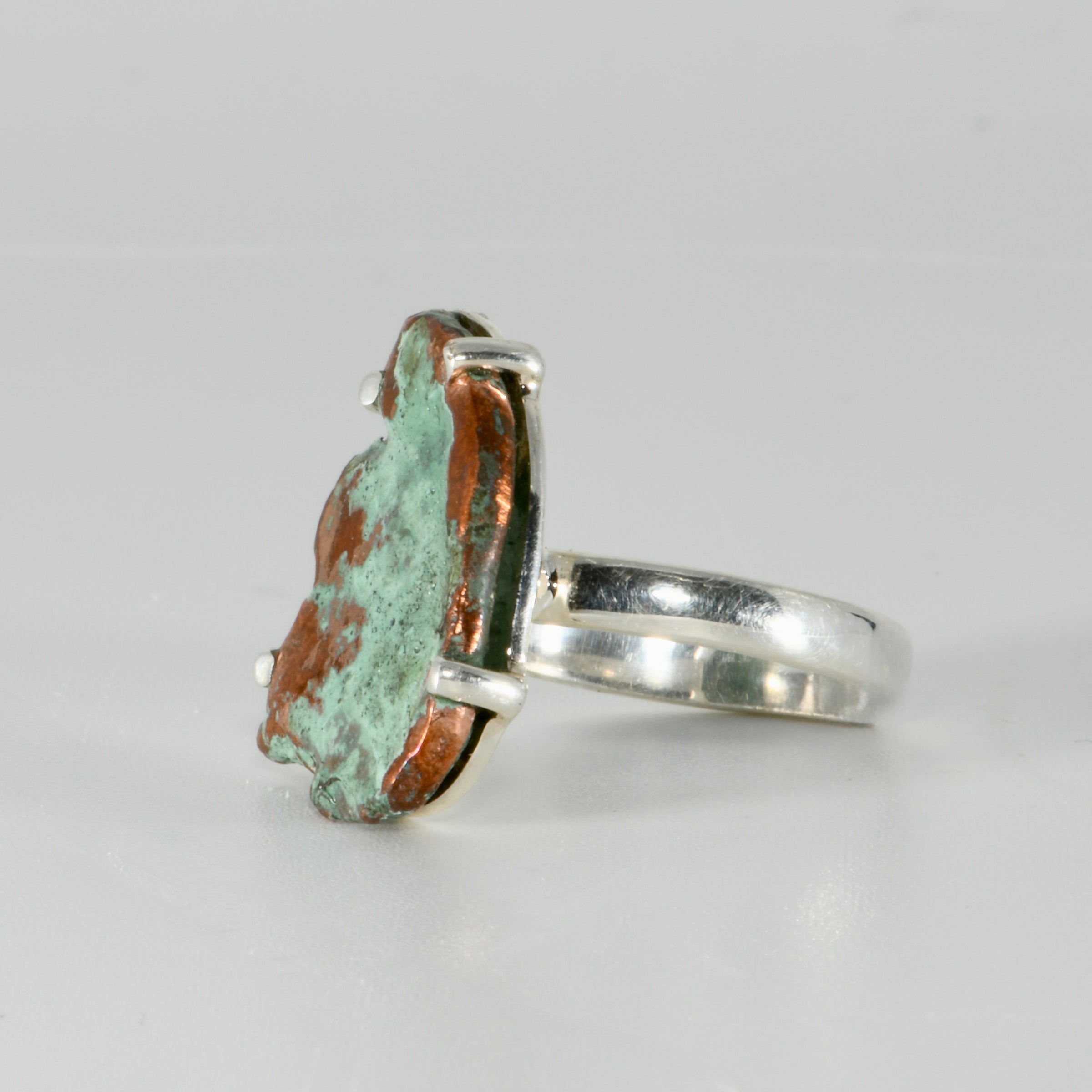 This peg set Copper Splash ring turns raw metal alchemy into wearable art. A freeform slice of “splash” copper—about 20mm tall by 15mm wide—sits in a simple sterling silver setting, showing off earthy copper tones washed with soft green-blue patina.