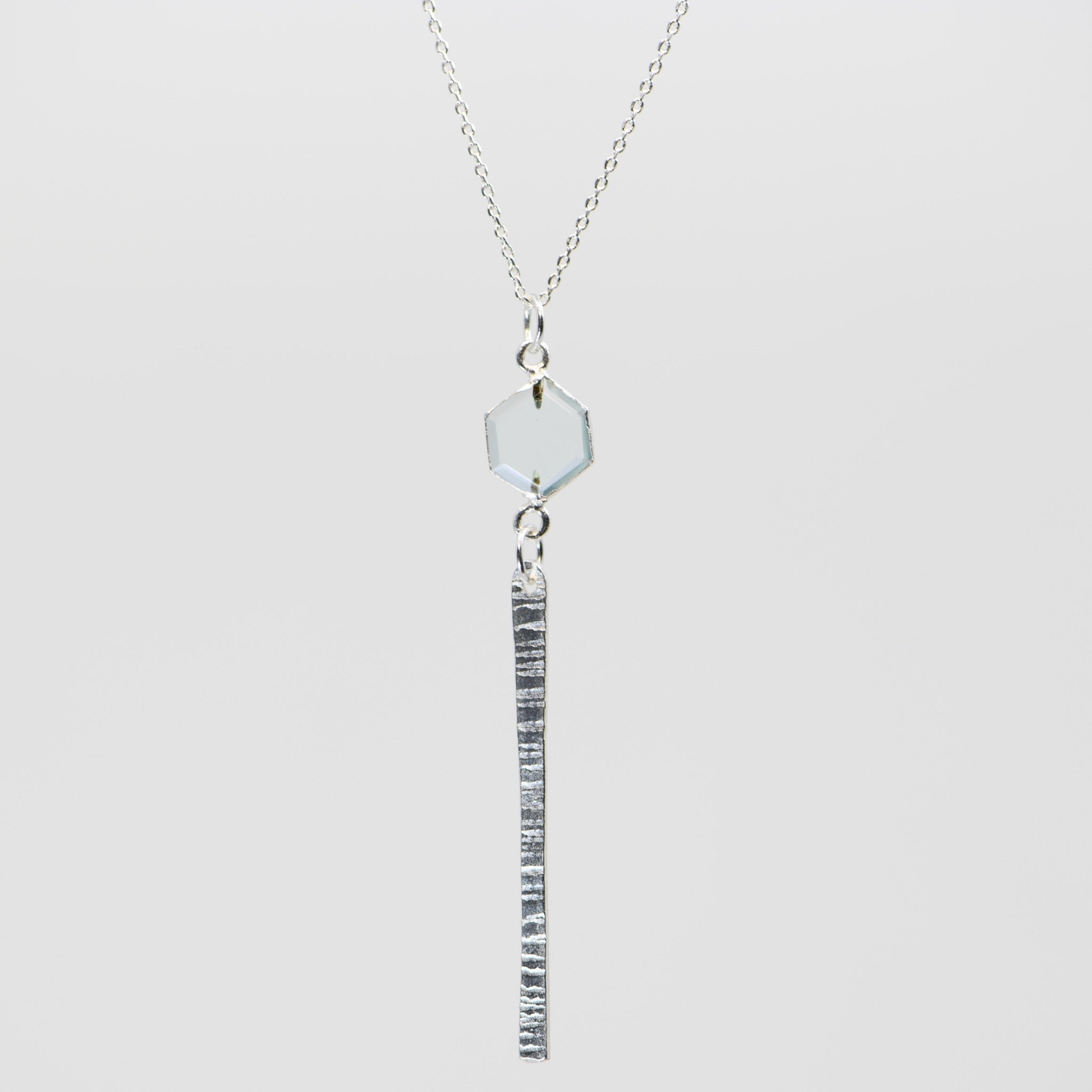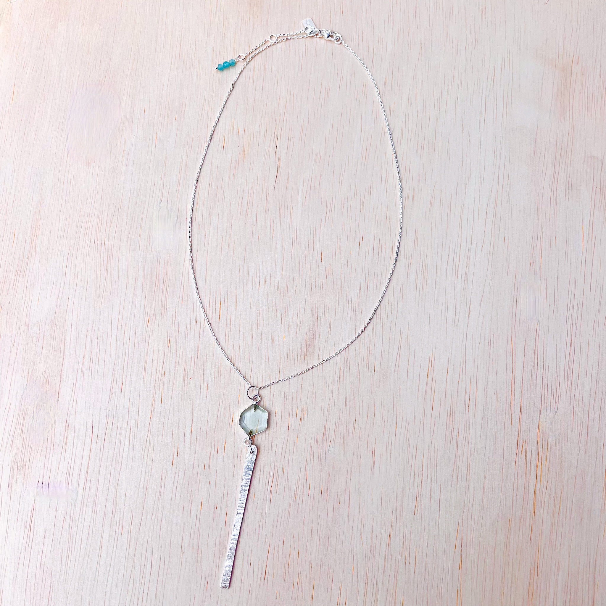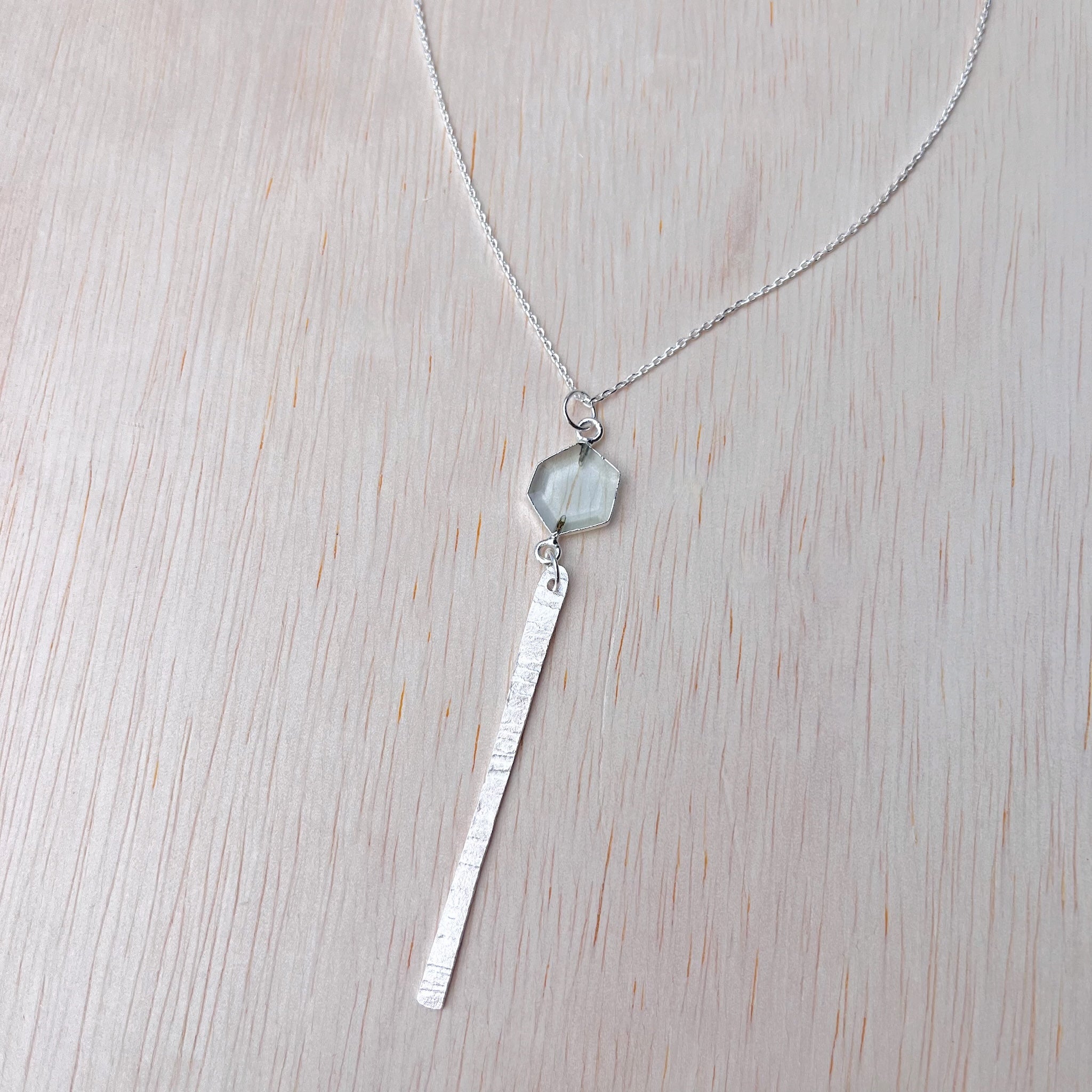 At the center of the necklace hangs a dazzling freeform Aqua Blue Topaz Stone, with a drop bar, hammered pendant, adding a touch of sophistication and brilliance to the design.