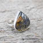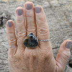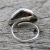This artisan-crafted piece features a mesmerizing 25mm x 25mm Marcasite gemstone, expertly bezel-set in gleaming 925 sterling silver. The pear silhouette adds a touch of romance to the ring's geometric precision, while the adjustable band ensures a perfect fit for sizes starting at 9.5.