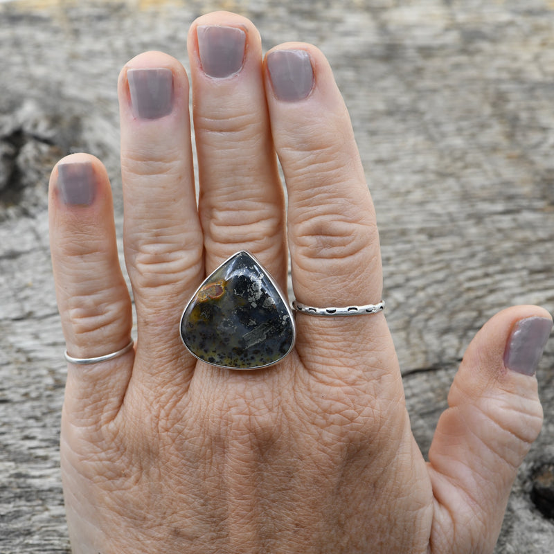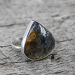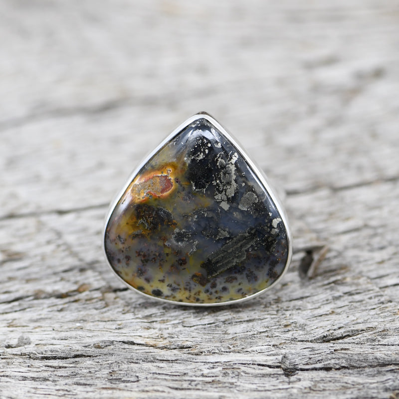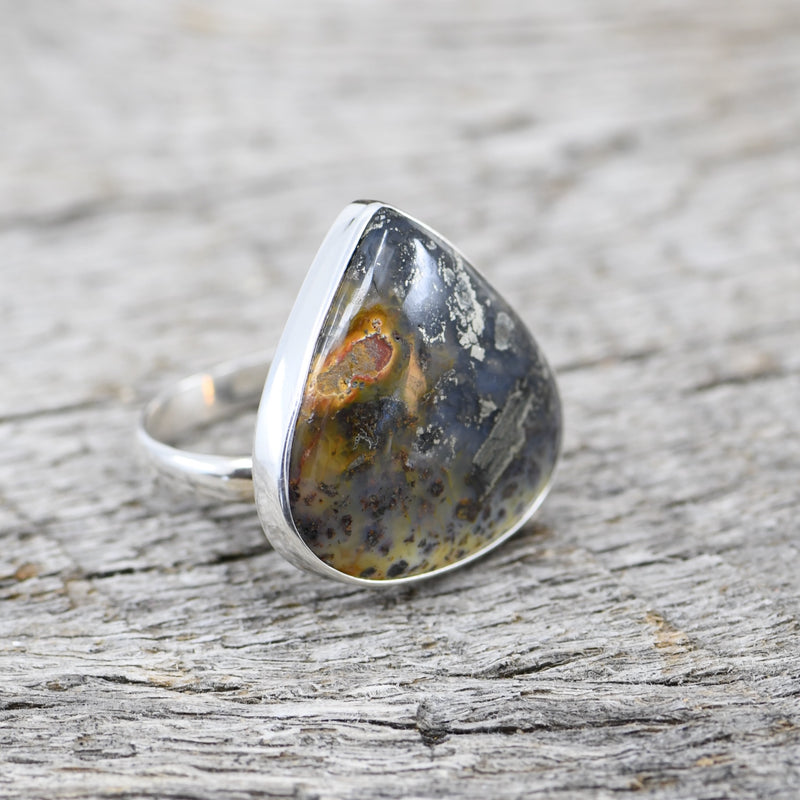 Every curve and setting of this ring bears the mark of expert craftsmanship. The sterling silver bezel embraces the Marcasite in a secure grip, highlighting the stone's natural beauty while protecting its edges. This one-of-a-kind piece showcases the dedication of skilled artisans who blend traditional metalworking techniques with contemporary styling.
